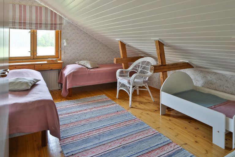 Päärakennuksen yläkerrassa kahden huoneen muodostama kokonaisuus neljälle aikuiselle ja neljälle lapselle. Yksi lisävuoteista on metallinen pinnasänky, kolme päästävedettäviä sänkyjä. Hyvä vaihtoehto perheelle, jossa pieniä lapsia, sillä käytössä on oma WC ja suihku. Liinavaatteet kuuluvat huoneen hintaan (aluslakana, pussilakana, tyynynliina, saunapyyhe).